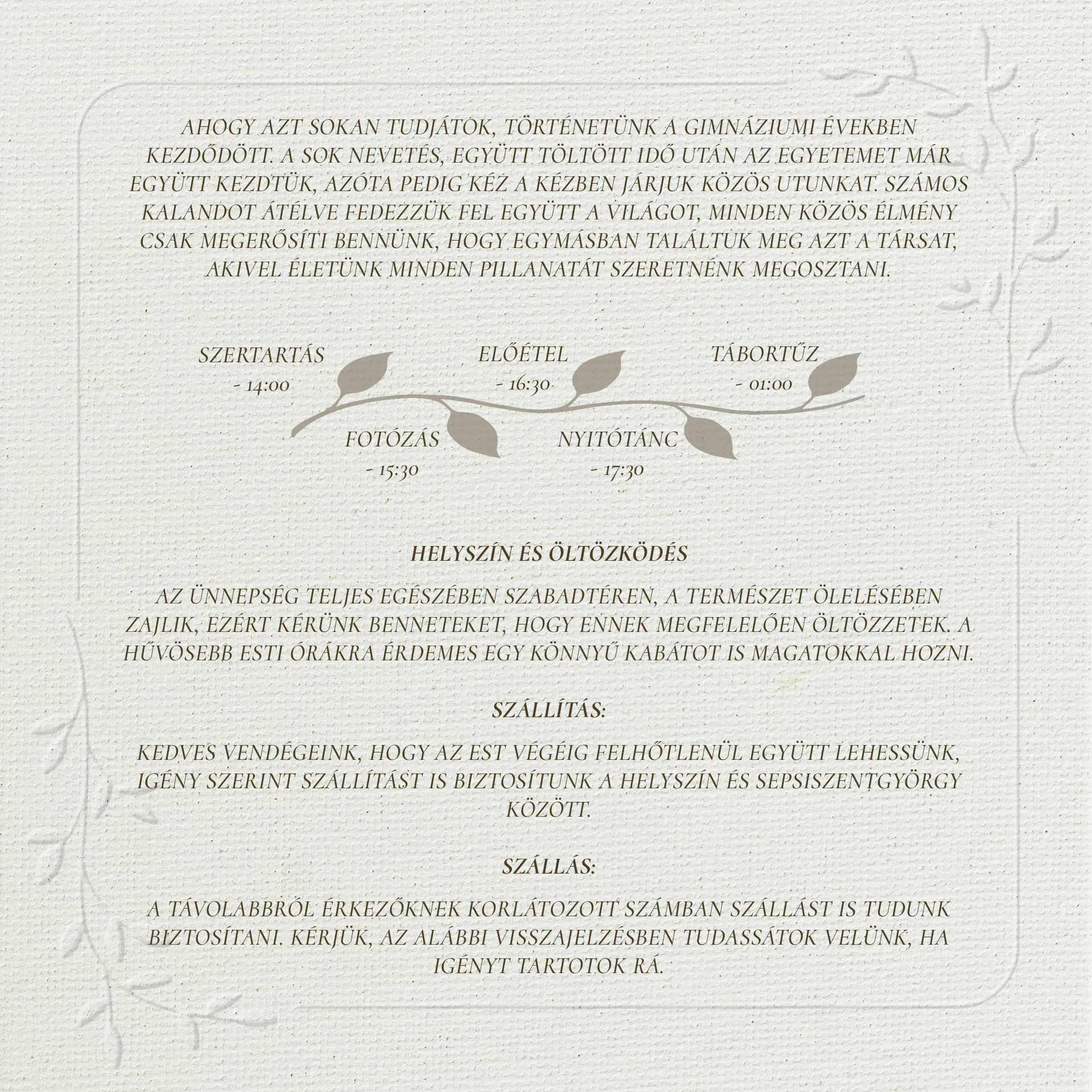 Mi azt szeretnénk, ha minden kedves családtagunk és barátunk részt tudna venni ezen az örömteli napunkon. Visszajelzés a részvételről az alábbi gombra kattintva.